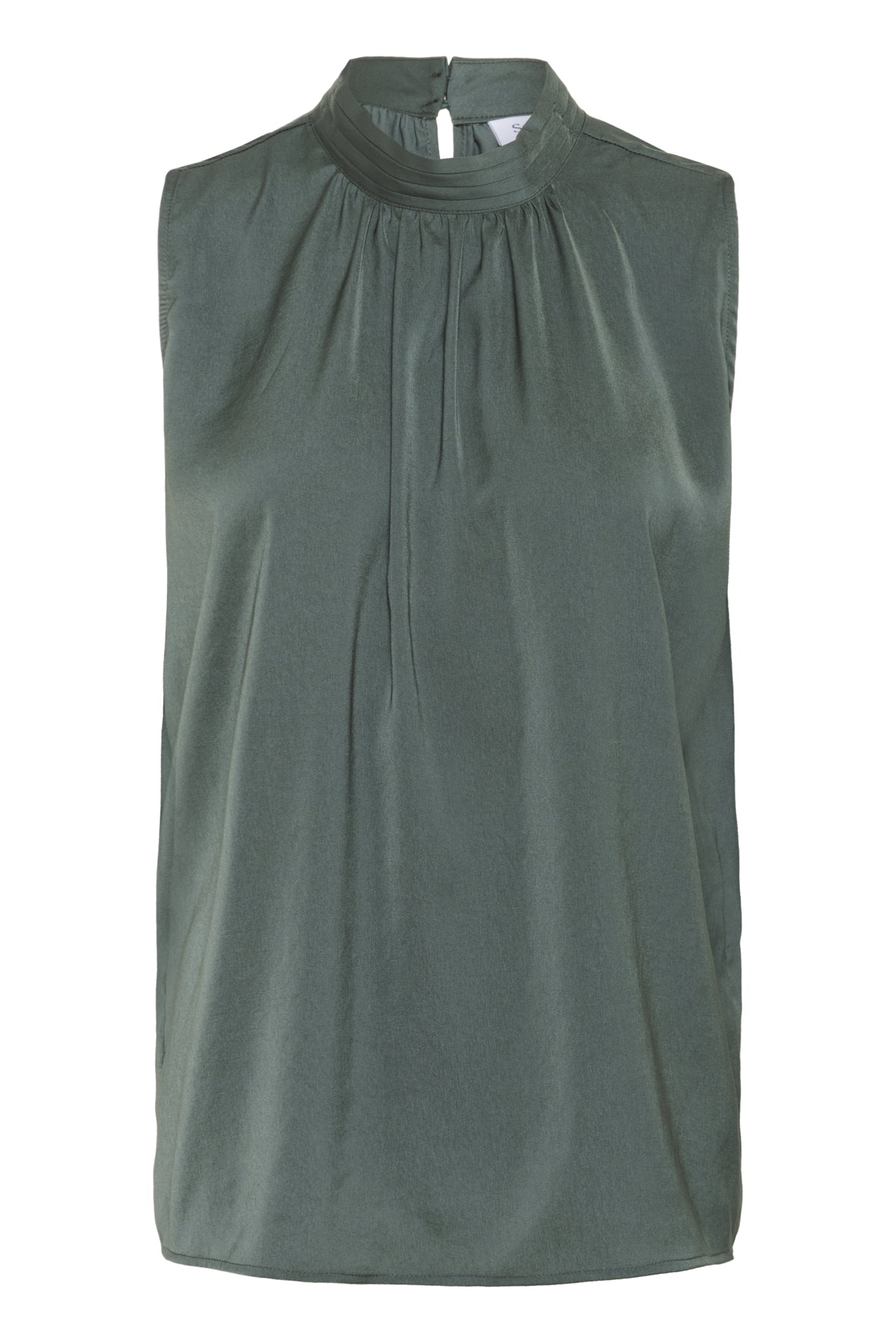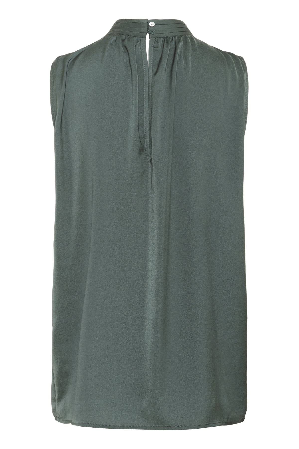 This sleeveless blouse features a delicate drape and gathered detailing around the high neckline. The lightweight fabric and keyhole button closure at the back add elegance, making it ideal for both formal and casual looks.